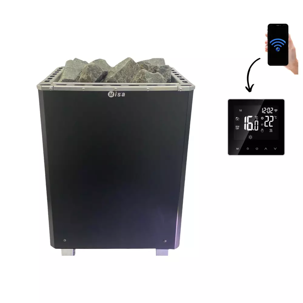 Misa 12,0 kW Sauna Sobası, yüksek ısıtma gücü ve harici kontrol paneliyle geniş hacimli sauna odalarında profesyonel performans sunar. Harici panel sayesinde sıcaklık ve zaman ayarlarını kolayca yapabilir, kullanıcı güvenliğini ve konforunu artırabilirsiniz. Paslanmaz çelik gövdesi uzun ömürlü kullanım sağlar, geniş taş haznesi ise ısıyı homojen biçimde dağıtarak dengeli bir sauna atmosferi oluşturur. Enerji verimliliği yüksek, sağlam ve estetik tasarımıyla Misa kalitesini yansıtır.