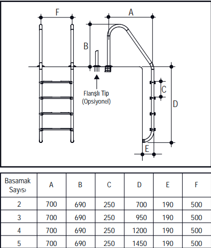 AISI 316 paslanmaz çelikten üretilmiş olup tuzlu su ve kimyasal koşullara karşı üstün dayanıklılığa sahiptir. 500 mm genişlik ve Ø 43 mm kol boru çapıyla pek çok havuz yapısına uyumludur. Paslanmaz çelik basamaklar kaymaz özelliklidir ve montaj donanımları (ankraj, rozet, cıvata) ile birlikte gönderilir. Hem özel hem ticari havuz projelerinde estetik ve güvenli bir giriş/çıkış çözümüdür.