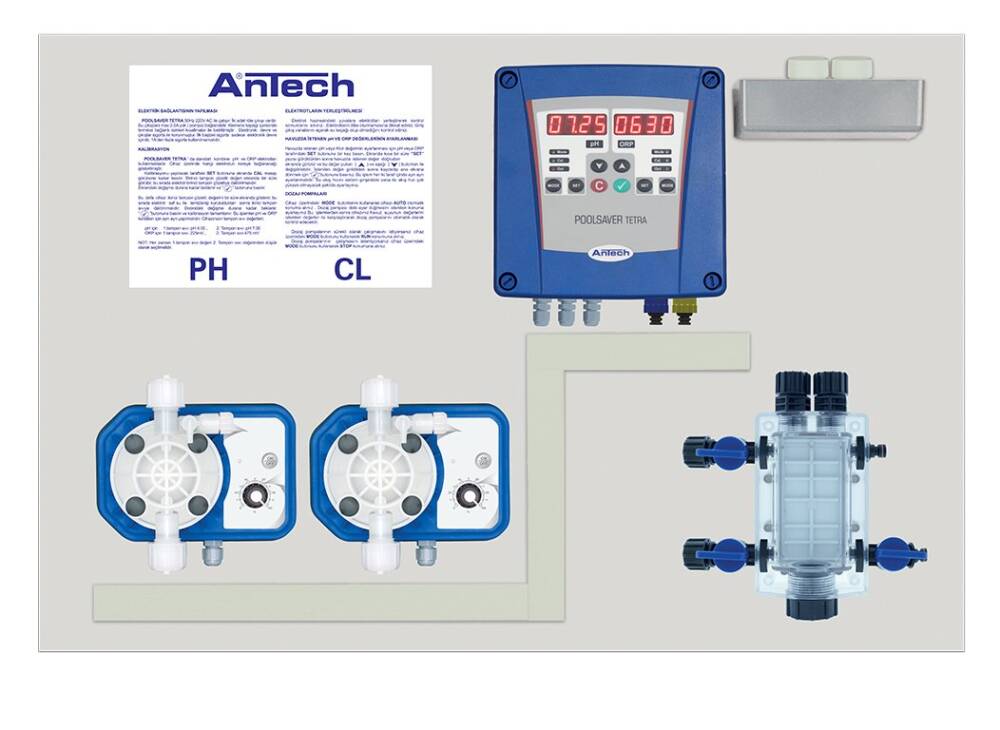 Antech Sistem 05 Otomatik İlaçlama Sistemi, 500 m³'e kadar olan havuzlar için tasarlanmış, pH ve klor seviyelerini otomatik olarak izleyip düzenleyen gelişmiş bir dozajlama ünitesidir. Poolsaver Tetra mikroişlemci tabanlı kontrol ünitesi sayesinde hassas ölçümler yaparak, havuz suyunun kimyasal dengesini sağlar. 2 adet Optima A 5L/10B model dozaj pompası ile gerekli kimyasalları doğru miktarda havuza pompalayarak su kalitesini optimize eder. Çift girişli elektrot haznesi ve kalibrasyon ekipmanları ile uzun ömürlü ve güvenilir bir kullanım sunar. IP65 koruma sınıfı sayesinde aşındırıcı kimyasallara karşı dayanıklıdır. Dijital ekran üzerinden kolay izleme ve ayar yapılabilir.