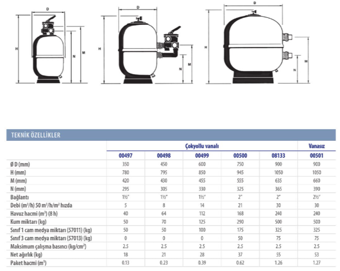 Maksimum çalışma basıncı: 2.5 kg / cm2. Maksimum filtreleme hızı 50 m3 / h / m2.