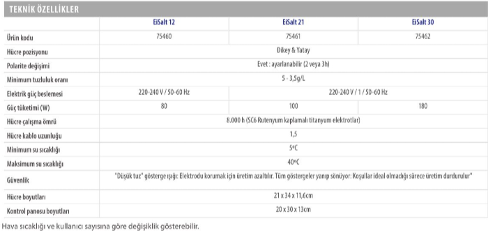 | Güvenlik Özellikleri | Akan su yoksa durma, tuz seviyesi düşükse uyarı/koruma, IP24 klasmanında kontrol ünitesi ile suya/ortama karşı dayanıklılık. |
