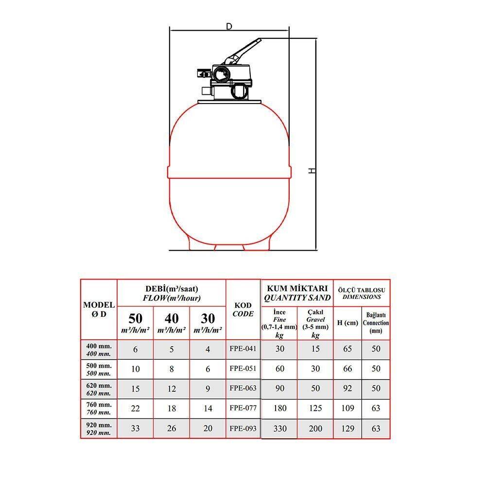 Nozbart Ø 620 mm Plastik Havuz Kum Filtresi, orta ve büyük havuzlarda berrak su elde etmek için yüksek verimli filtrasyon sağlar. 15m³ debi , 2 BAR çalışma basıncı ve 4 BAR test basıncıyla güvenli ve dayanıklı bir yapıya sahiptir. Özel kollektör sistemi sayesinde tıkanmayı önler, su sirkülasyonunu optimize eder. DN 240 geniş kapak ve 6 yollu vana bağlantısı ile kolay bakım sunar. Uzun ömürlü plastik gövdesi ve yüksek performansıyla her havuz sistemi için ideal çözümdür.