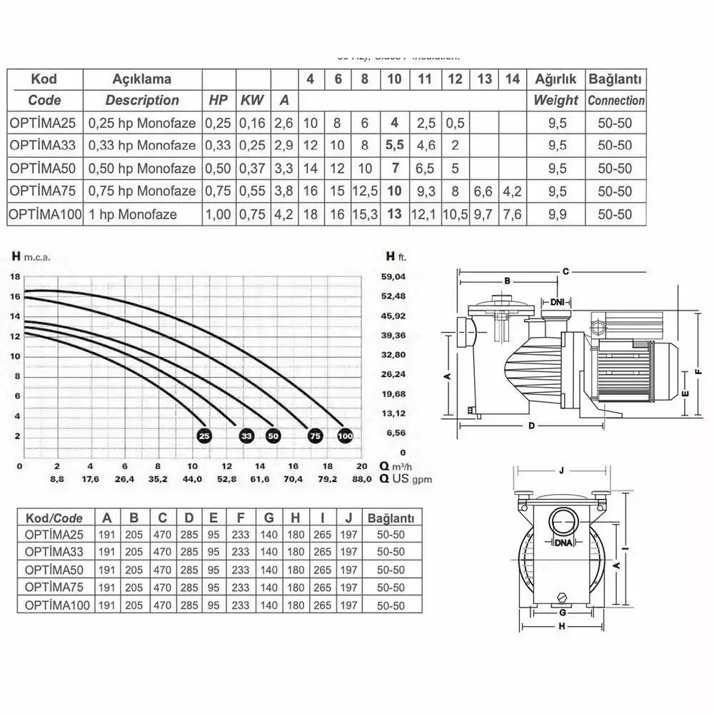Saci Optima Serisi 0.50 HP Monofaze Havuz Pompası, küçük ve orta ölçekli havuzlar için ekonomi ve performansı birleştiren bir seçimdir. 220 V monofaze bağlantı imkânı sayesinde ev tipi sistemlere kolayca entegre edilir. Gövde ve difüzörü polipropilen malzemeden üretilmiş olup, kimyasallara karşı yüksek direnç gösterir. AISI 316 paslanmaz çelik mil ve IP55 korumalı motoru ile uzun ömürlü çalışır. 7 m³/saat debi kapasitesi ile suyunuzu etkin şekilde dolaştırır. Ayrıca geniş ön filtre sepeti ve şeffaf kapağı sayesinde bakım süreçleri daha kolaydır.