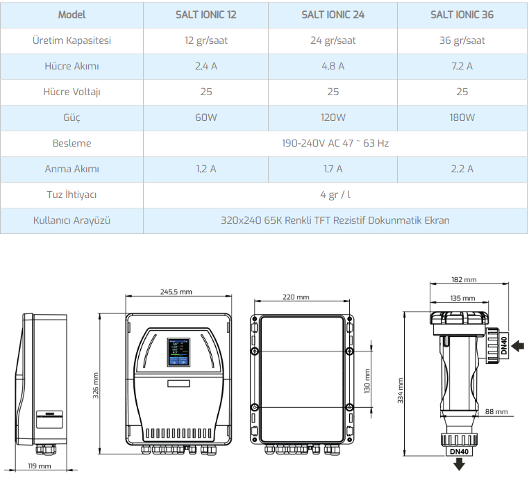 | Klor Üretim Kapasitesi | 36 gram/saat |