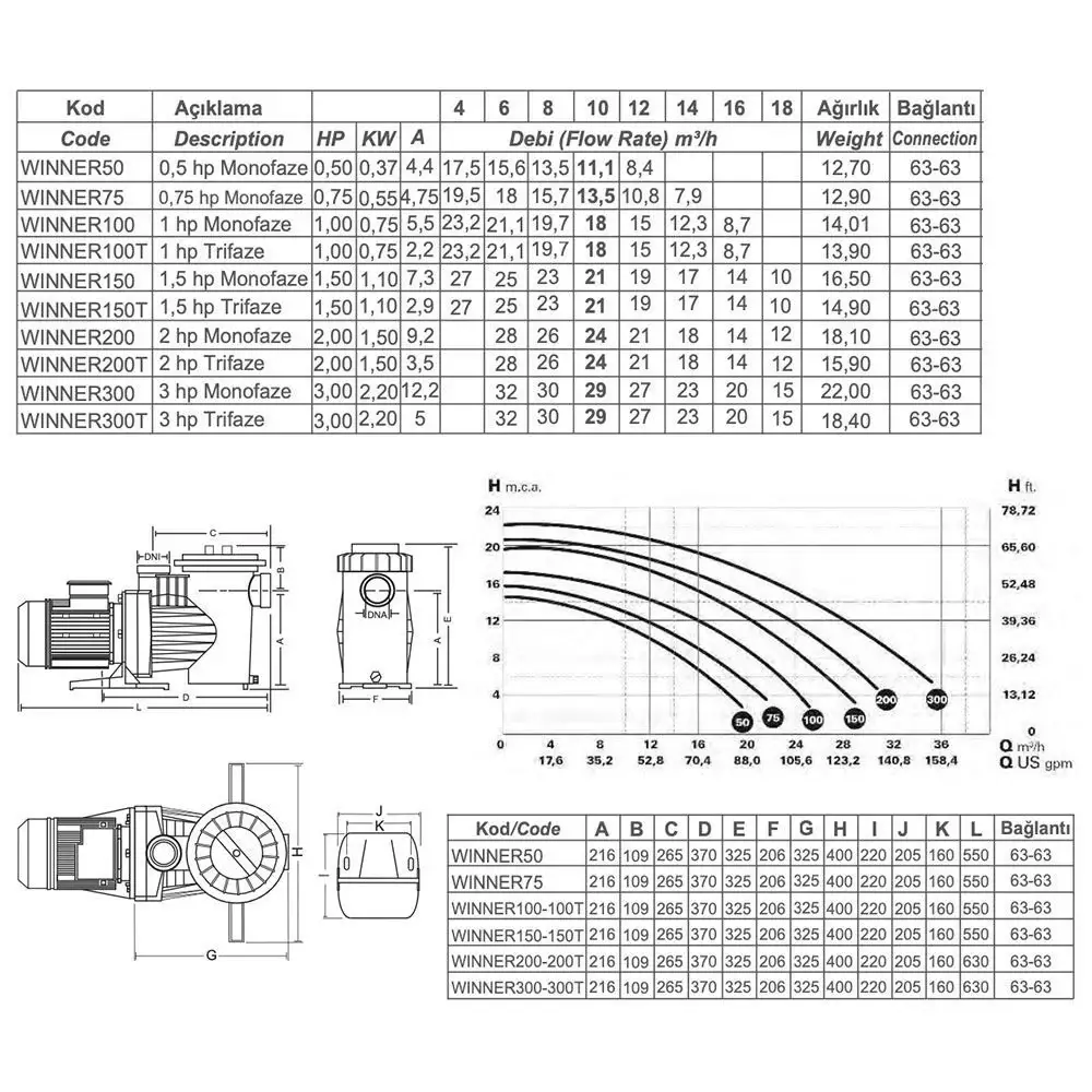 Saci Winner 1.5 HP Trifaze Havuz Pompası, 27 m³/h debi kapasitesi ve güçlü 1.5 HP motoruyla orta-büyük ölçekli havuzlarda etkili filtrasyon sağlar. Dayanıklı cam elyaf takviyeli gövde, paslanmaz mil ve IP55 motor koruması ile uzun ömürlü performans sunar. Sessiz, verimli ve tuzlu suya uyumlu yapısıyla profesyonel havuz sistemleri için güvenilir bir tercihtir.